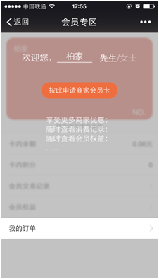 客戶點開公眾號下的會員專區(qū),可以申請成為,店鋪會員,享受會員優(yōu)惠,并且查看自己的會員信息。
